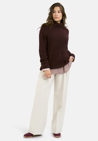 Burgunderfarbener Rollkragenpullover aus weichem Strickmaterial, mit geripptem Saum und Bündchen, lockerer Passform und überschnittenen Schultern.