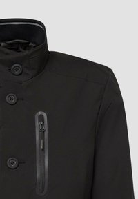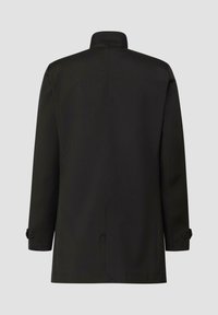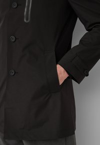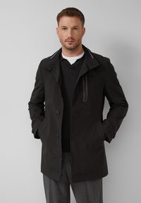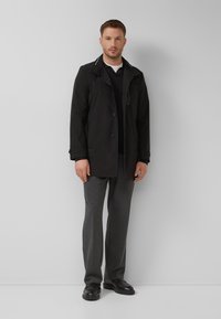 Mann trägt einen schwarzen Knopfmantel über einem schwarzen Pullover und weißen Hemd, steht mit den Händen in den Taschen vor einem einfarbigen grauen Hintergrund.