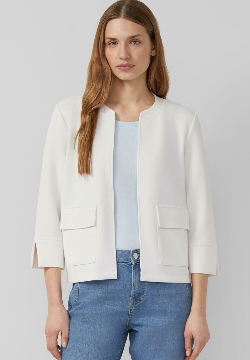 Frau trägt eine weiße Jacke mit offenem Vorderteil und Klappentaschen über einem hellblauen Oberteil und blauer Jeans, steht vor einem schlichten grauen Hintergrund.