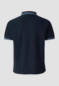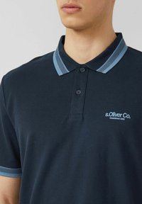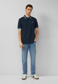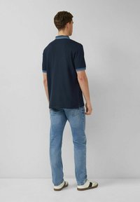 Junger Mann trägt ein marineblaues Poloshirt mit hellblauem Kragen und Ärmelsaum, kombiniert mit hellblauen Jeans, steht vor einem grauen Hintergrund.