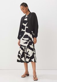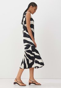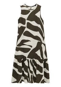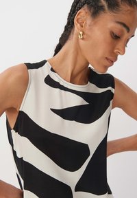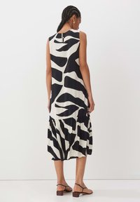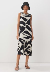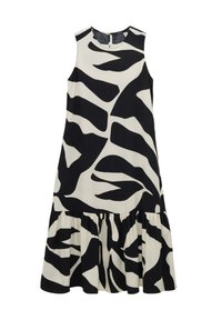 Ärmelloses, gestuftes Kleid aus leichtem Stoff mit auffälligen schwarzen abstrakten Mustern auf einem cremigen Hintergrund. Verstellbare Taillenpartie.
