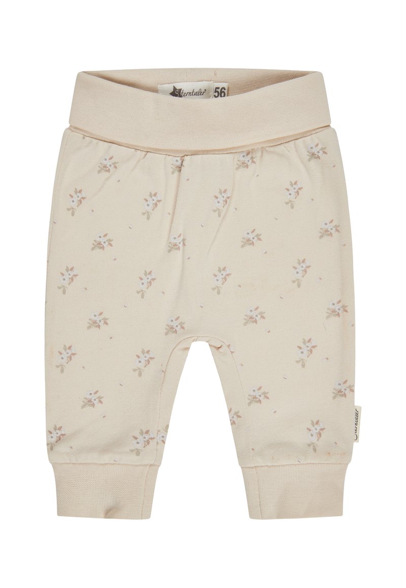 Beige Babypants aus weichem Baumwollmaterial, mit einem floralen Muster in Pastellfarben, elastischem Bund und gerippten Bündchen.