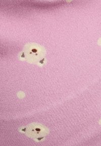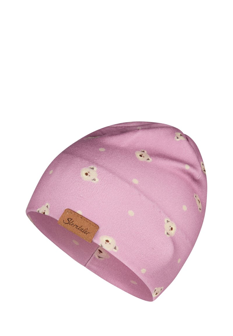 Rosa Fleece-Mütze mit einem Allover-Muster aus Bärenköpfen und weißen Punkten. Verfügt über ein braunes Leder-Logo-Patch am Bündchen.