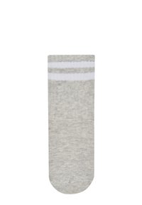 Graue Kleinkindersocke mit weißen doppelten Streifen nahe dem Bündchen und rutschfesten Noppen an der Sohle, isoliert auf weißem Hintergrund.