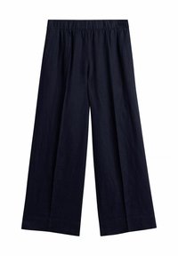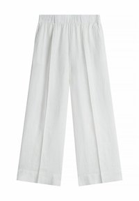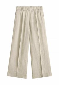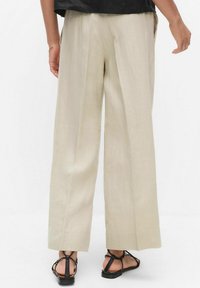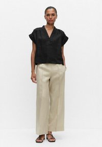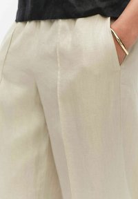 Beige Leinenhose mit weitem Bein und elastischem Bund, getragen mit schwarzen flachen Sandalen mit Riemchen und einem schwarzen Oberteil.