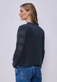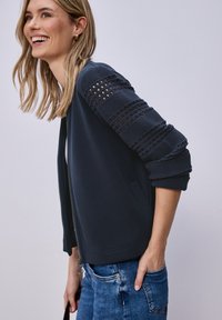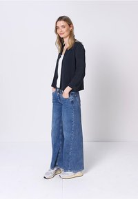 Junge Frau in einer marineblauen Jacke mit Reißverschluss und strukturierten Ärmeln, weißem Oberteil und blauen Jeans vor einem einfarbigen Hintergrund.