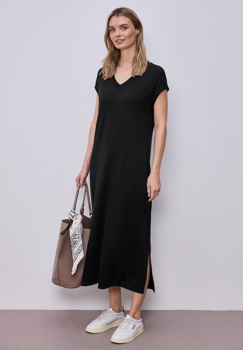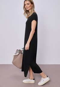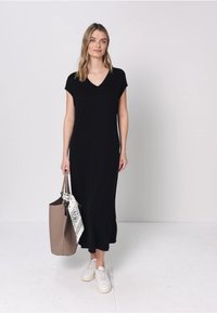 Frau trägt ein schwarzes Midi-Kleid mit V-Ausschnitt und kurzen Ärmeln mit Seitenschlitzen, weiße Sneaker, hält eine taupefarbene Einkaufstasche mit weißem, gemustertem Schal.