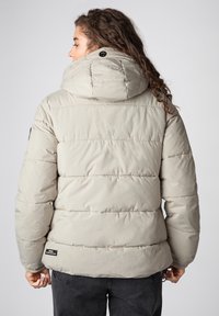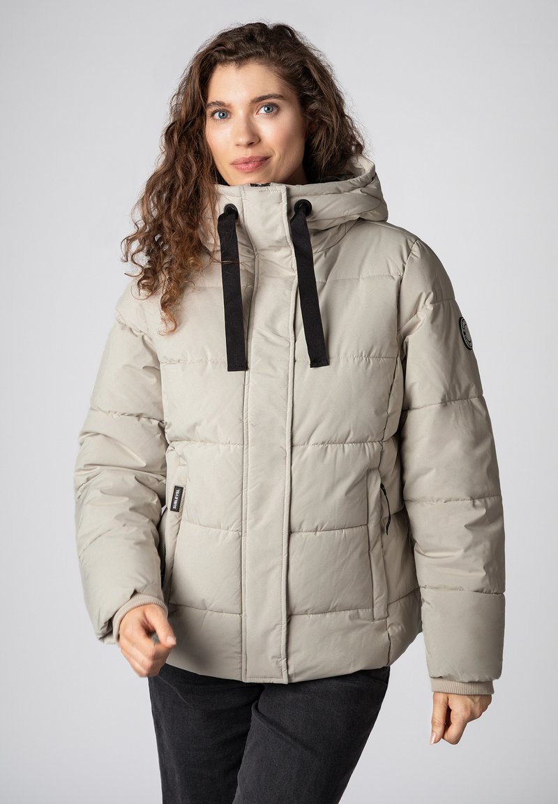 Hellbeige Steppjacke mit Kapuze, schwarzen Kordeln, gestepptem Design und elastischen Bündchen. Zwei seitliche Reißverschlusstaschen.