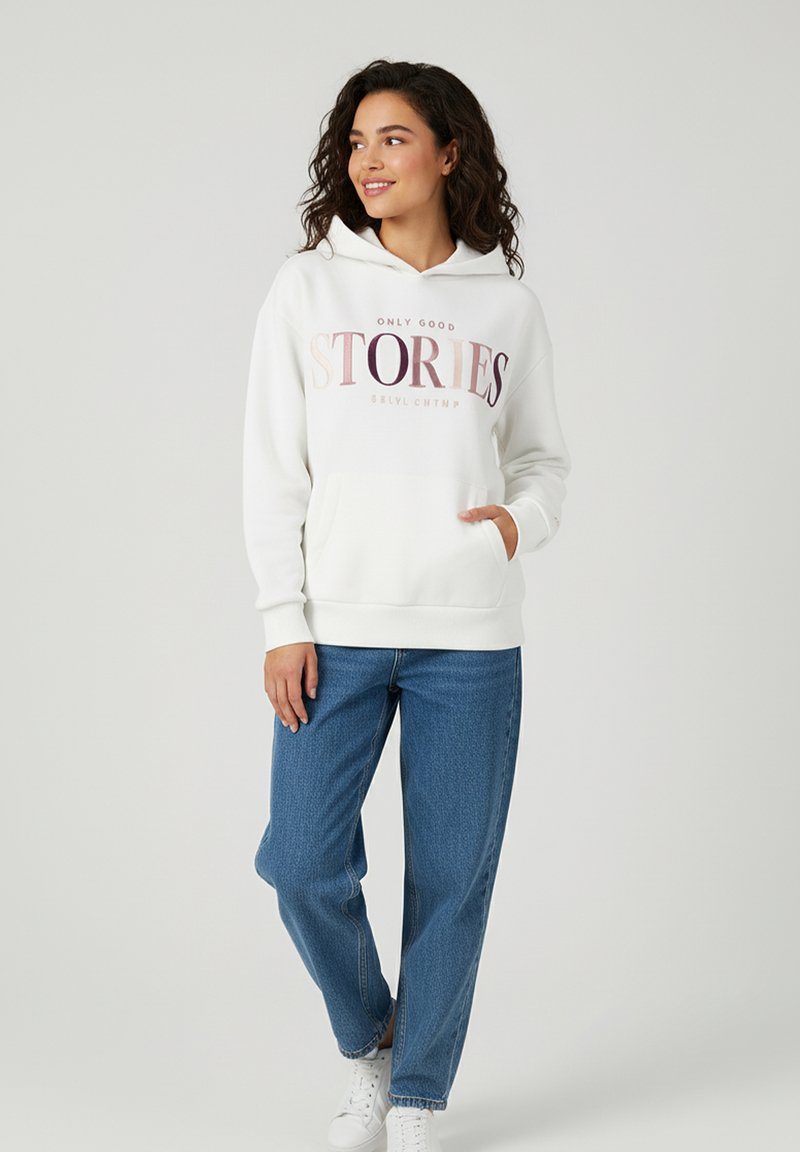 Weißer Kapuzenpullover mit "NUR GUTE GESCHICHTEN" in verlaufenden Farben aufgedruckt, ausgestattet mit einer Fronttasche, gerippten Bündchen und einem lockeren Schnitt, kombiniert mit blauen Jeans.