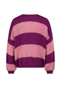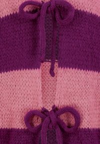 Strickjacke mit lila und rosa Streifen, offene Vorderseite, mit Bindebändern, langen Ärmeln sowie gerippten Bündchen und Saum.