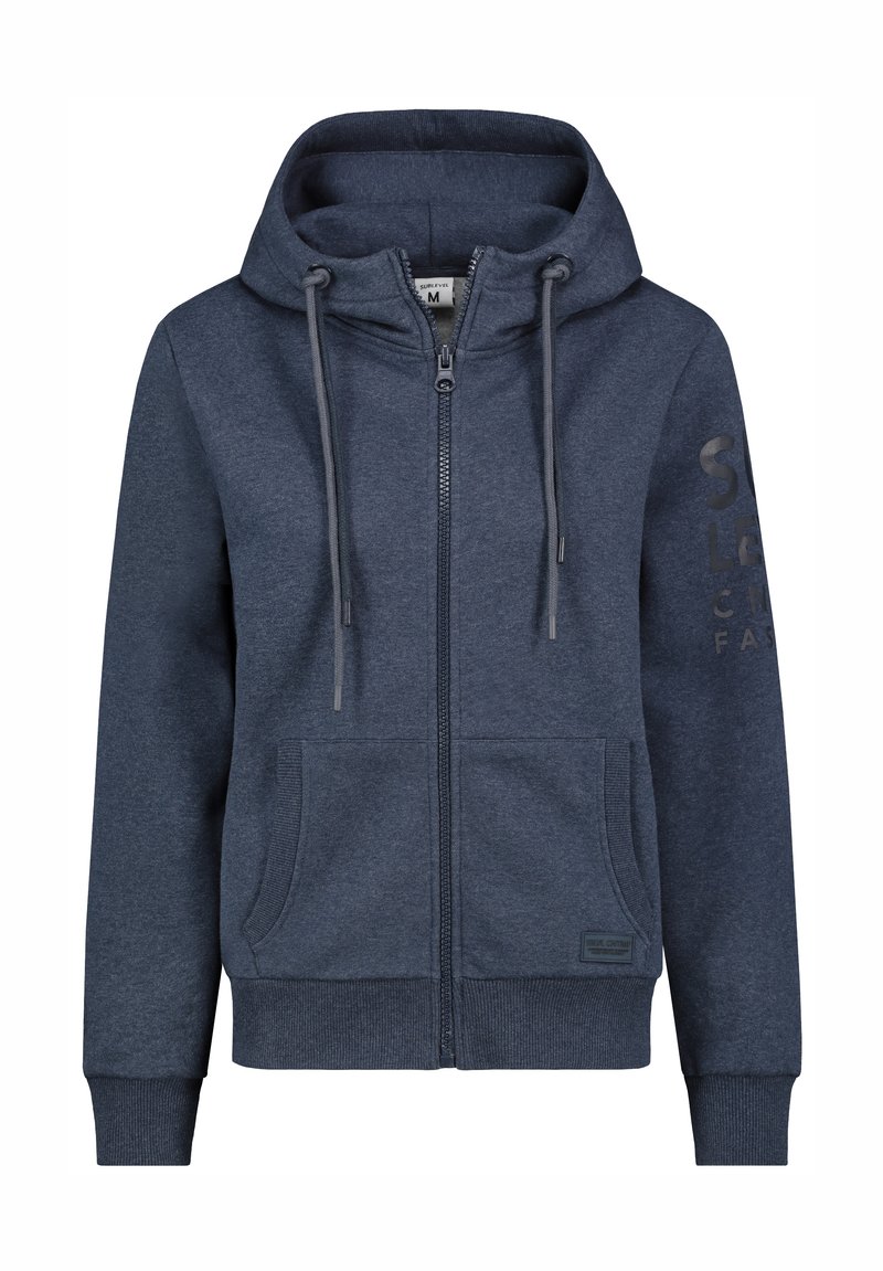 Navy Zip-Hoodie aus Baumwollmischung mit Kapuze und Zugband, zwei vorderen Taschen, gerippten Bündchen und einem bedruckten Akzent an der linken Ärmel.