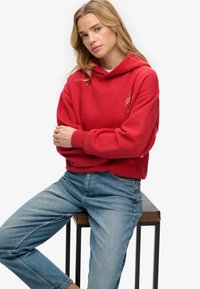 Junge Frau in rotem Superdry-Hoodie und blauen Jeans, mit einer Hand in der Tasche, stehend vor weißem Hintergrund.