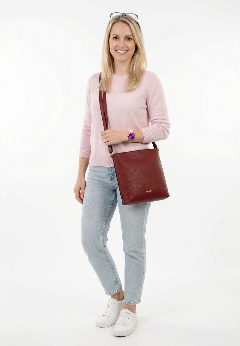 Lächelnde Frau mit Brille auf dem Kopf, rosa Pullover, helle Jeans, weiße Sneakers, lila Uhr, trägt eine große braune Leder-Umhängetasche.