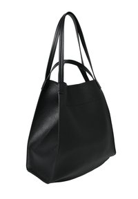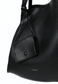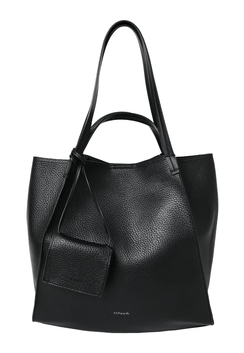 Schwarze Ledertasche mit Struktur, langen Griffen und einer kleinen, angehängten Tasche, mit dezentem Markenlogo "Tatuum" auf der Vorderseite.