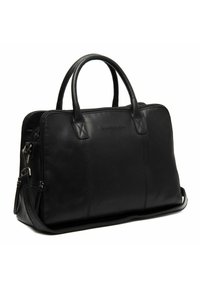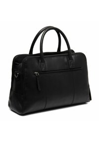 Schwarze Lederhandtasche mit strukturiertem Design, doppelten Obergriffen, einem abnehmbaren Schulterriemen und einem Reißverschlussverschluss. Glatte Textur mit dezenten Nähten.