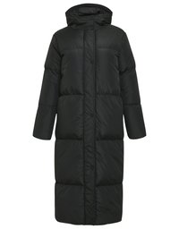 Bordeauxfarbener gepolsterter langer Mantel mit Kapuze, Reißverschluss und Druckknöpfen. Verfügt über Seitentaschen und eine strukturierte Oberfläche, kombiniert mit schwarzen Leggings und Sneakers.