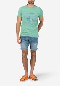 Mintgrünes T-Shirt mit kurzen Ärmeln und grafischem Aufdruck, kombiniert mit hellen Denim-Shorts mit fransigen Kanten und orangen Slide-Sandalen.