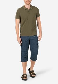 Olivgrünes Polohemd, marineblaue Cargo-Shorts mit Taschen und braune Sandalen mit verstellbaren Riemen an einem aufrechten männlichen Model.