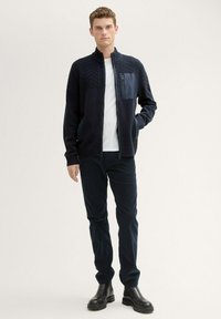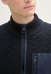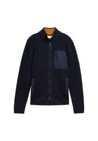 Moderne Strickjacke mit seitlichen Eingriffstaschen und großer Brusttasche aus Nylon. Mit Logo-Badge am Ärmel und Rippbündchen am Saum.