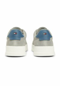 Flacher grauer Wildleder-Sneaker mit weißer Sohle, seitlichen Schnürsenkeln, blauem Fersenpatch und kleinem Tommy Hilfiger-Logo an der Außenseite.