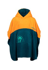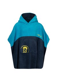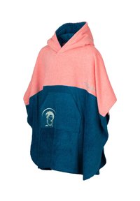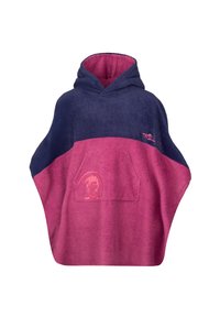 Rosa und blaue Kapuzen-Poncho aus weichem Frottee-Stoff. Verfügt über eine Fronttasche mit einem grafischen Design und gesticktem Markenlogo.