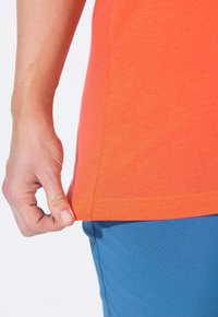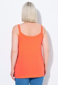 Oranges ärmelloses Tanktop mit rundem Ausschnitt und breiten Trägern, aus einem weichen Stoff; getragen mit blauen Hosen.