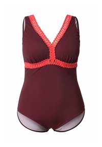 Schwarzer Einteiler-Badeanzug mit tiefem V-Ausschnitt, kunstvollem Häkelbesatz und figurbetonter Silhouette. Weicher, glatter Stoff ohne sichtbare Muster.