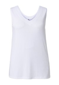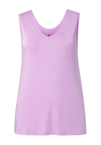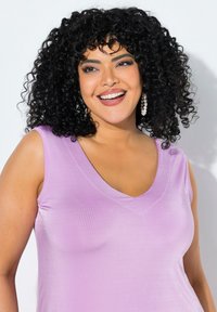 Lächelnde Frau mit lockigem Haar, die ein ärmelloses lavendelfarbenes Oberteil und passende Hosen trägt, steht vor einem weißen Hintergrund.