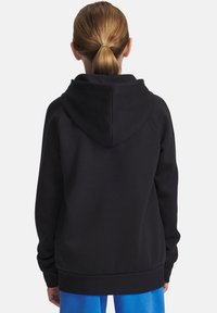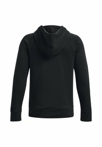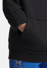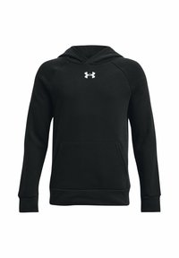 Junge Person trägt einen schwarzen Under Armour Hoodie, neon-grüne verspiegelte Sonnenbrille, blaue Hose, mit Händen in den Taschen des Hoodies vor weißem Hintergrund.