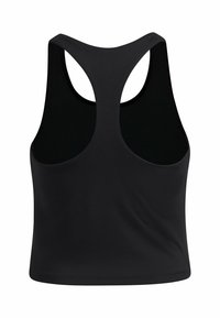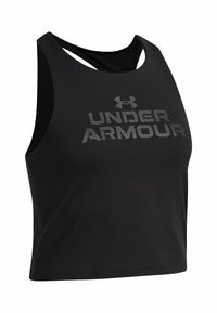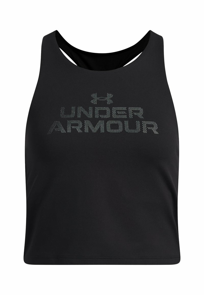 Schwarzer Sport-BH mit solidem Design, Racerback-Schnitt und auffälligem "UNDER ARMOUR"-Logo aus silbernen Punkten auf der Vorderseite.