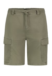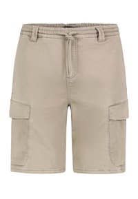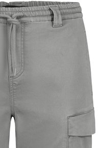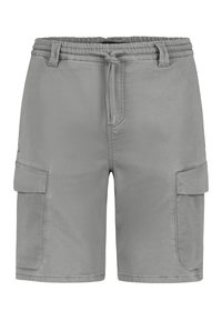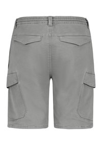 Grau Cargo-Shorts mit elastischem Bund, Zugbandverschluss und seitlichen Taschen. Hergestellt aus leichtem Stoff mit glatter Textur.