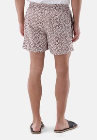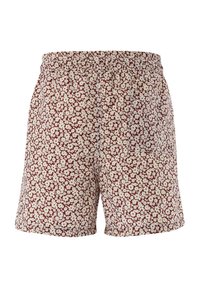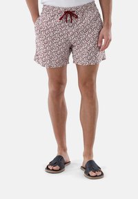 Rote und weiße bedruckte Badeshorts mit elastischem Bund und verstellbarem Kordelzug, kombiniert mit schwarzen Slidesandalen mit Kreuzriemen.