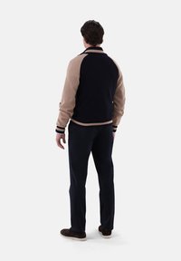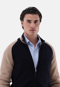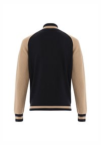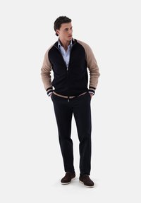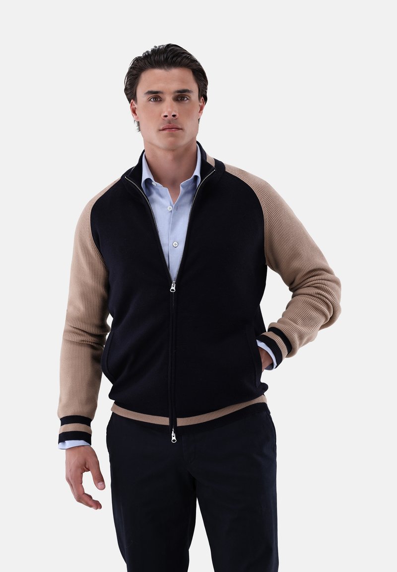 Strickjacke mit Reißverschluss, die einen schwarzen Körper und beigefarbene Rippärmel aufweist, mit einem gestreiften Bündchen. Glatte Textur, lässiges Design und taillierte Silhouette.