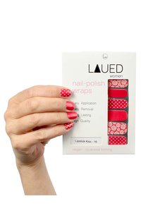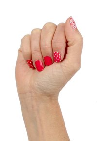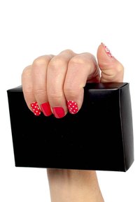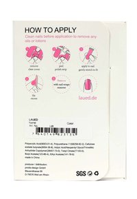 Entfernen Sie die transparente Schutzfolie und den mittleren Streifen von der ausgewählten Nagelfolie. Dies erleichtert das Ablösen der einzelnen Nagelfolien. Wählen Sie die passende Folie für den Nagel aus. Befestigen Sie diese dann mittig am Nagel und drücken Sie sie unten leicht an. Die Folie darf nicht an der Haut haften. Ziehen Sie die Folie leicht nach oben, damit sie glatt auf dem Nagel aufliegt. Drücken Sie dann die Folie von der Nagelmitte zu den Rändern hin, um Luftblasen zu glätten. Am einfachsten schneiden Sie die Folie mit einer Schere knapp über dem Nagelrand ab. Feilen Sie nun mit der Nagelfeile die überschüssige Folie entsprechend der Nagelform ab.