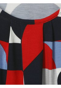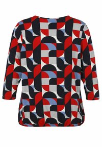 Damen-Langarmshirt mit rundem Ausschnitt, elastischem Saum und geometrischem Muster in Rot, Schwarz, Weiß und Blau mit Quadraten und geschwungenen Formen.