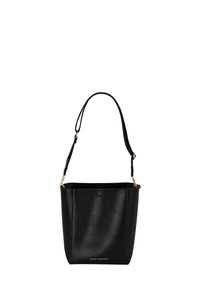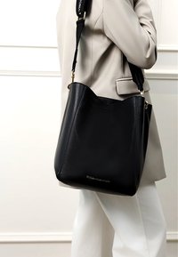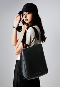Junge Frau mit schwarzer Cap und weißem T-Shirt hält große schwarze Lederhandtasche mit breitem Tragegurt über der Schulter.