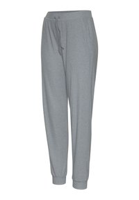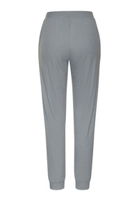 Hellgraues Loungewear-Set mit einem V-Ausschnitt und langärmligen Oberteil sowie passender Hose. Weicher Stoff mit lässiger Passform. Keine sichtbaren Muster oder Applikationen.