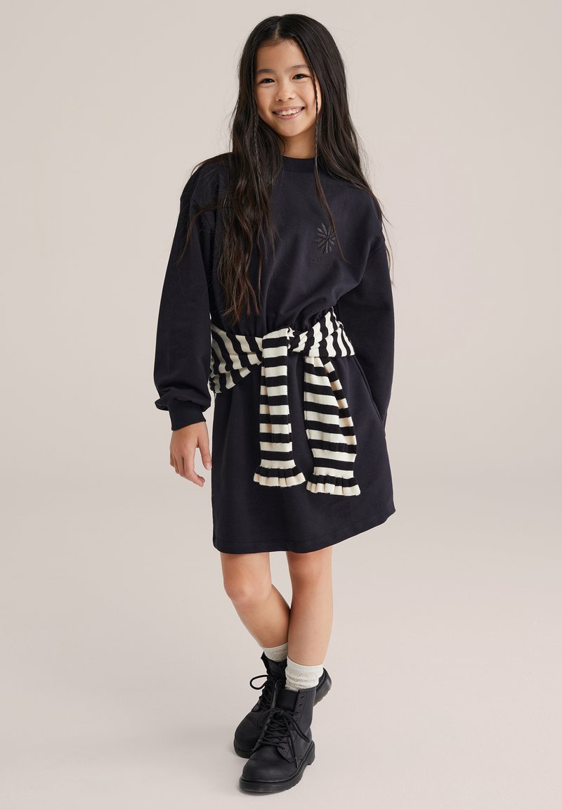 Navyblaues Sweatshirtkleid mit einem gestickten Design, versehen mit einem schwarz-weiß gestreiften, gebundenen Schal als Gürtel auf Taillenhöhe und kombiniert mit schwarzen Stiefeln.