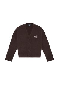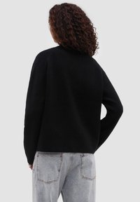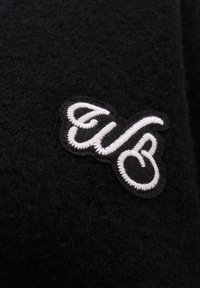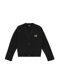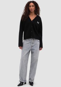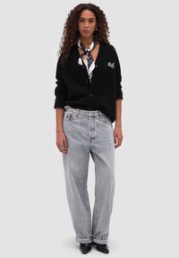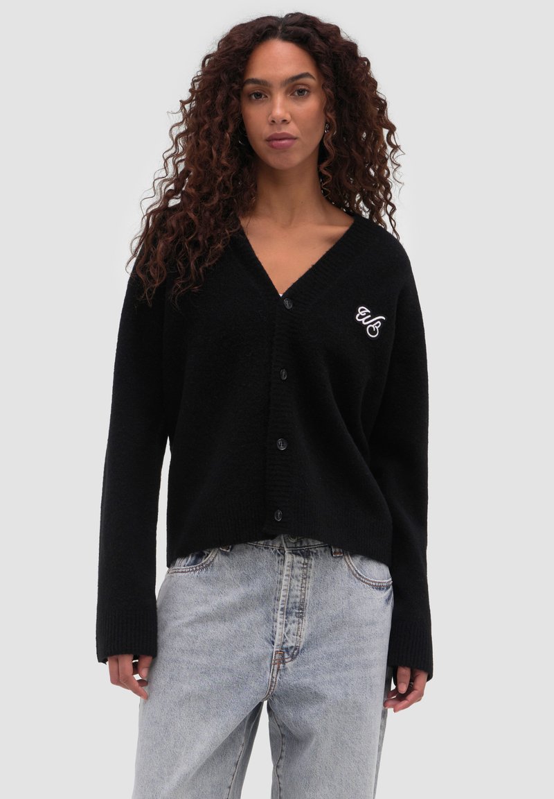 Frau mit lockigem Haar, die einen schwarzen, geknöpften Cardigan mit weißem, gesticktem Logo und hellblauen, hoch taillierten Jeans trägt und steht.