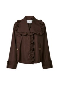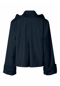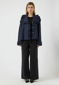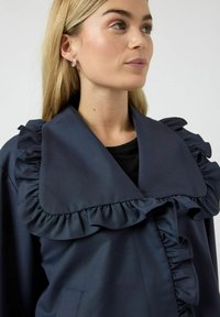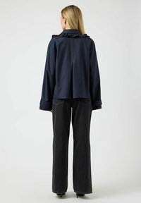 Marineblaue Jacke mit gerafftem Kragen und Vorderseite, zwei Knöpfen und weiten Ärmeln. Glatter Stoff mit leichtem Glanz und strukturiertem Design.
