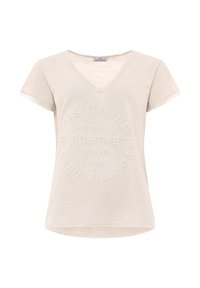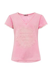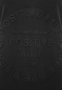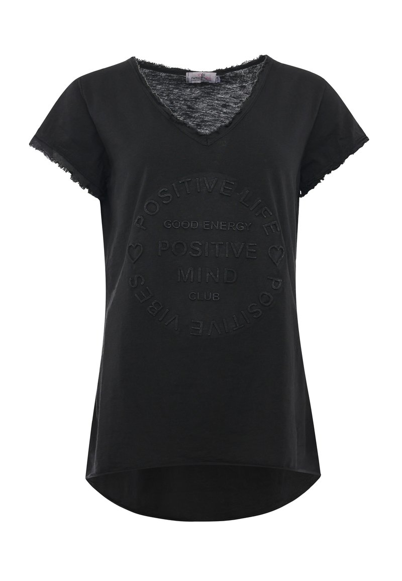Schwarzes T-Shirt mit V-Ausschnitt, kurzen Ärmeln, fransigen Kanten und strukturiertem, erhabenem Text in kreisförmigem Muster auf der Vorderseite.